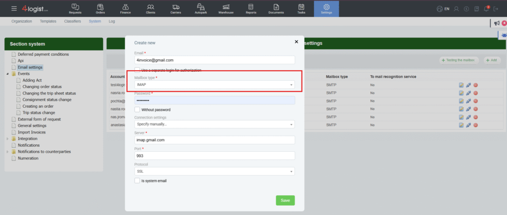 In the “Add email” window, enter the email address and password. Set Mailbox type → IMAP.