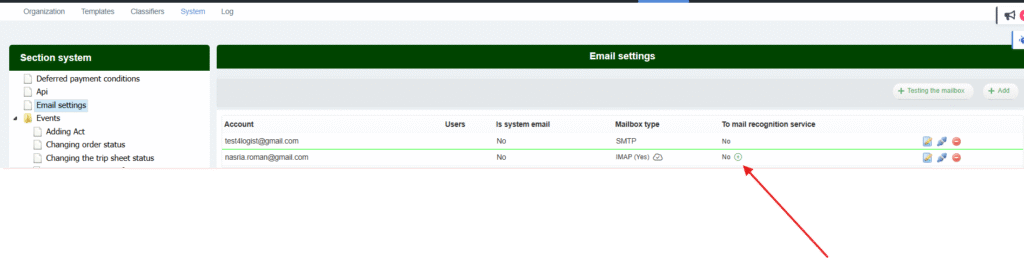 If the settings are correct, the text ‘Yes’ will appear in the ‘Mailbox type” section. In the “To Mail Recognition service” section, the ‘ + ‘ icon will appear to enable importing invoices from this mail. Click on this icon.