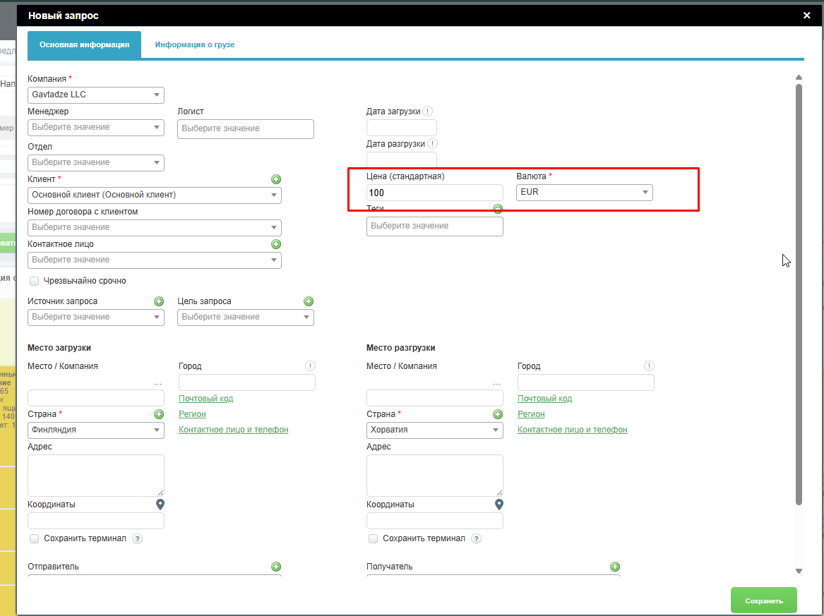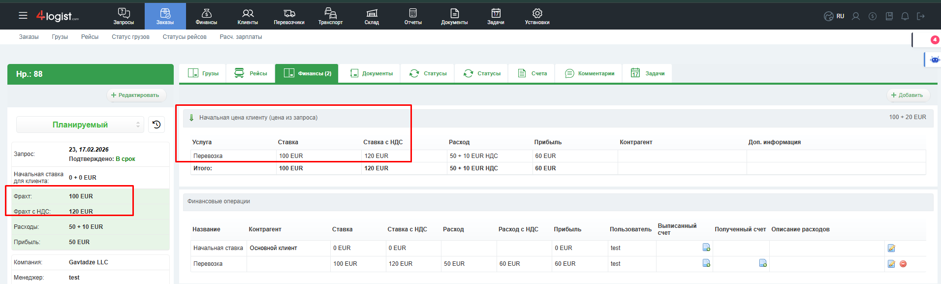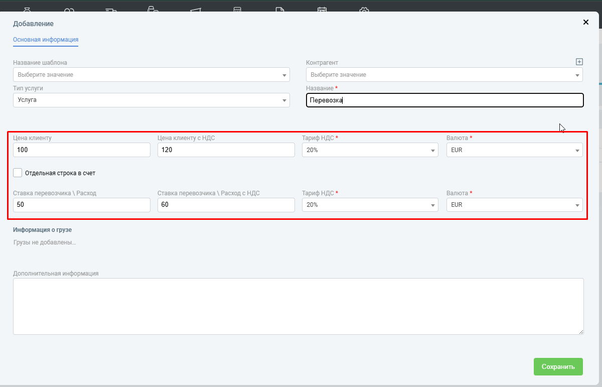 В ценовом предложении для этого предусмотрены отдельные поля: одно для ставки перевозчика (расход), другое — для цены клиенту (доход).