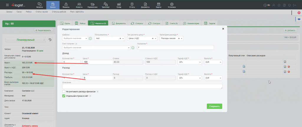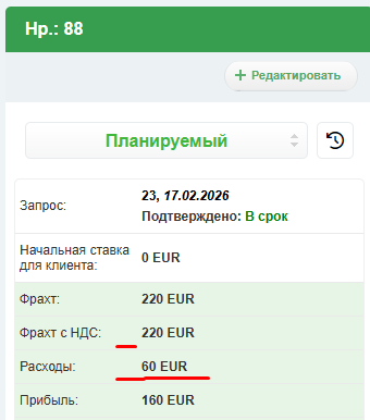 - Доход — сумма, которая увеличивает фрахт и будет выставлена клиенту к оплате.