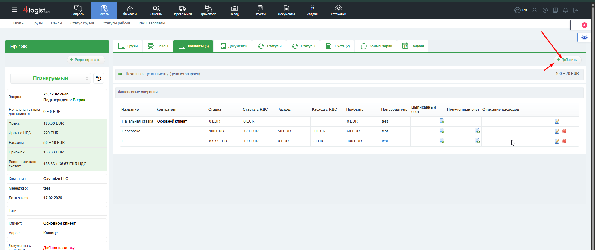 Если в рамках заказа, помимо основной услуги (перевозка, экспедирование и т.д.), появляются дополнительные услуги, они добавляются во вкладке «Финансы».