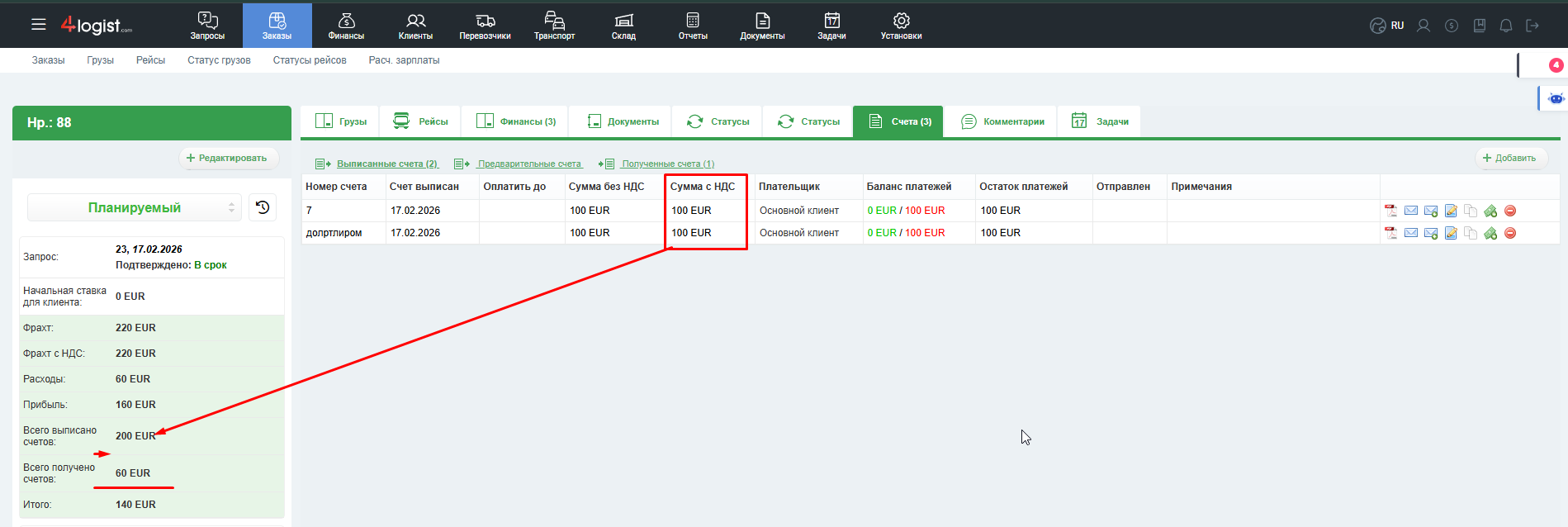 В примере на скриншоте выше как раз такая ситуация: Фрахт 220, а счетов выписано на 200