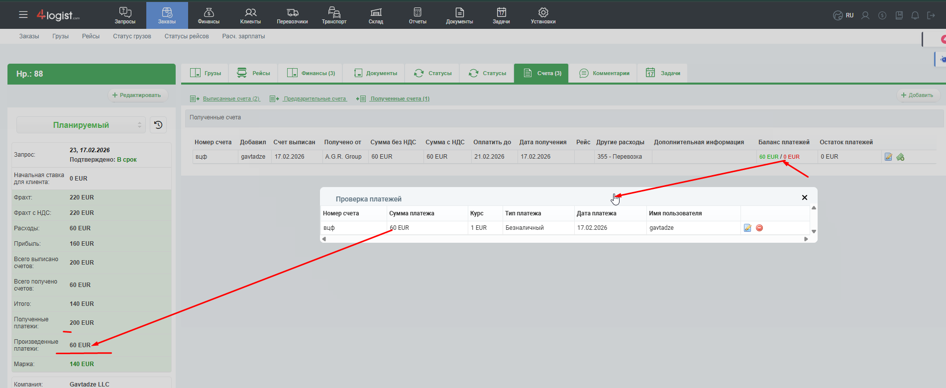 Отдельной вкладки для платежей нет — все платежи всегда привязаны к соответствующим счетам.