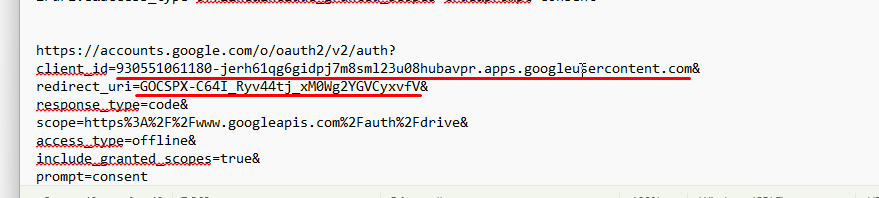Будет что-то подобное:https://accounts.google.com/o/oauth2/v2/auth?client_id=**************&redirect_uri=**********************&response_type=code&scope=https%3A%2F%2Fwww.googleapis.com%2Fauth%2Fdrive&access_type=offline&include_granted_scopes=true&prompt=consent