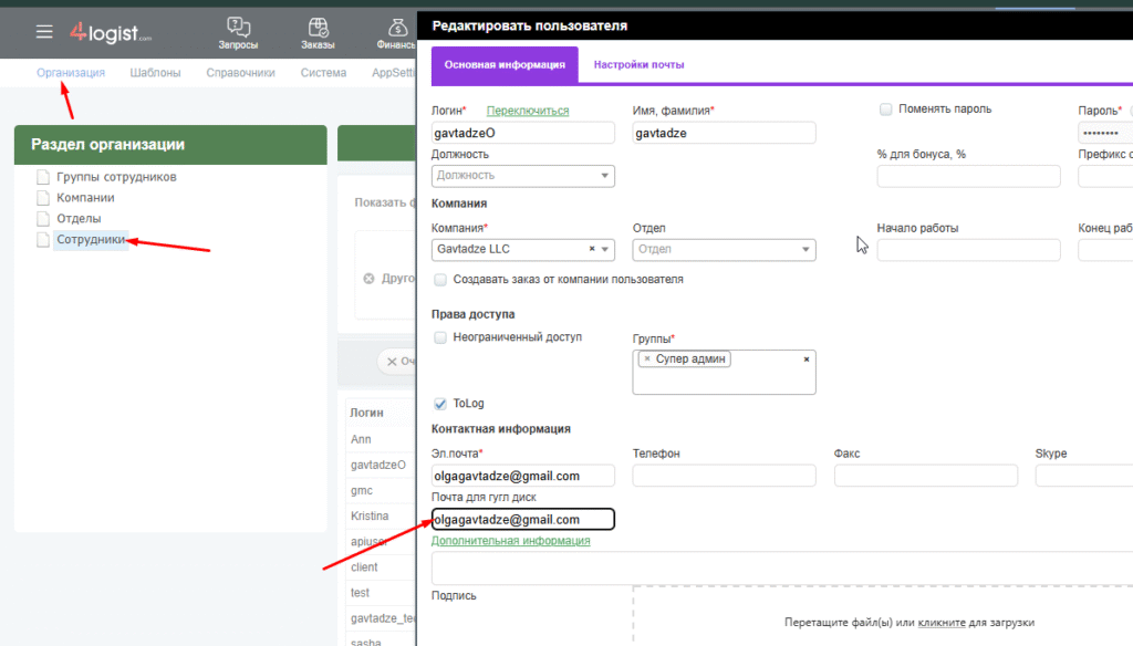 16. В карточку сотрудника необходимо внести почту, для которой мы делаем интеграцию