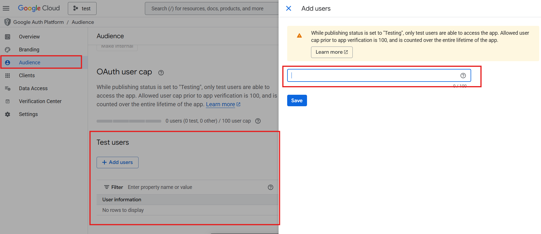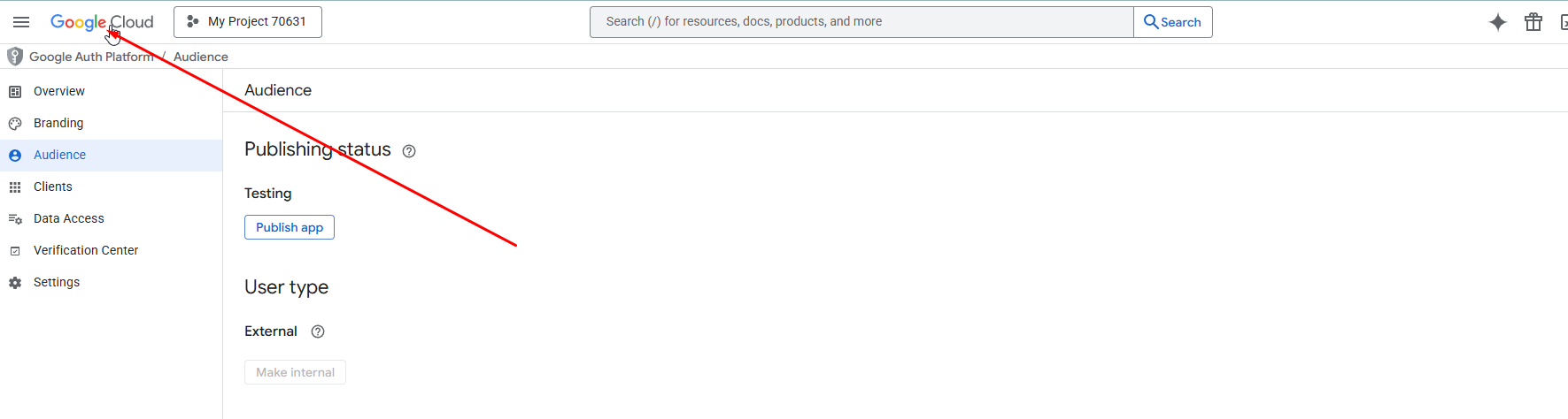 7. Далее в левом меню нужно открыть Audience и добавить вашу почту в Test users