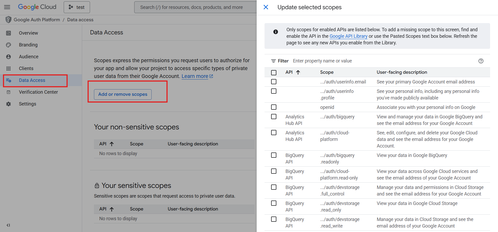 8. Затем открыть Data Access и прописать в scopes https://www.googleapis.com/auth/drive