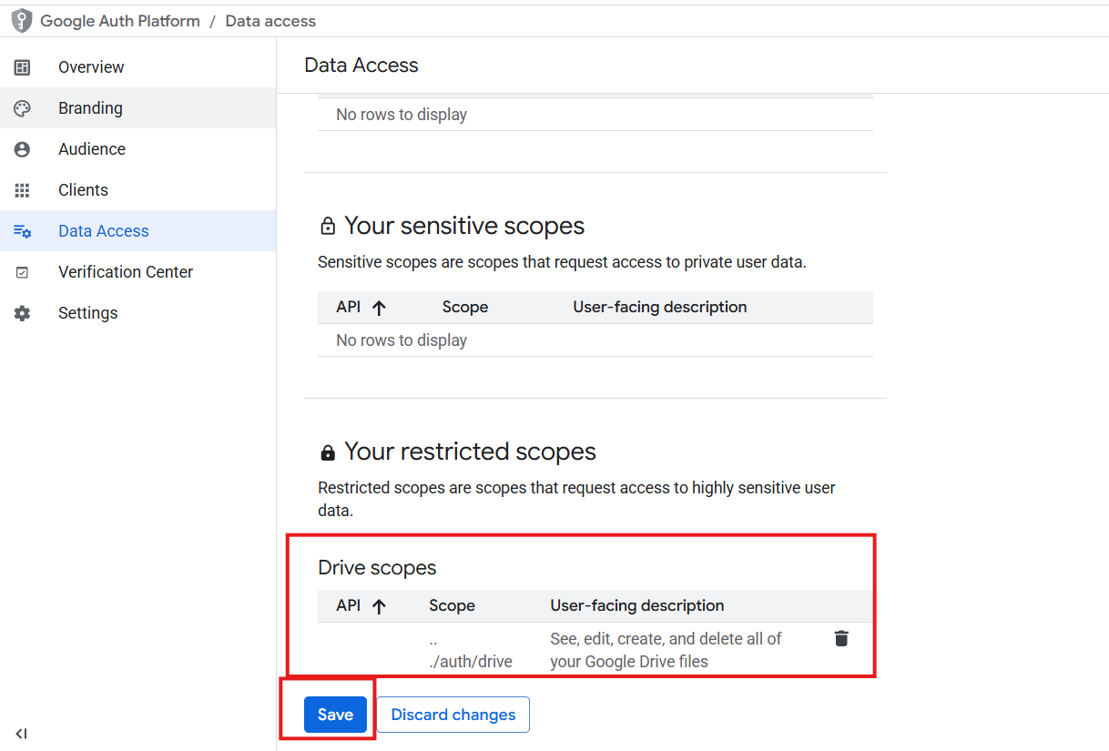 9. Ниже на странице в Drive scopes появится ваша ссылка. Обязательно нужно сохранить настройки.