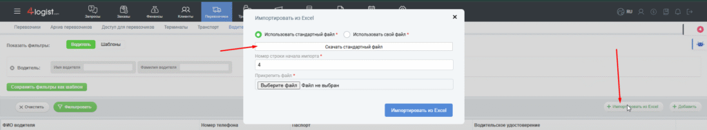 Для того, чтобы импортировать данные о водителях, перейдите в Перевозчики — Водители