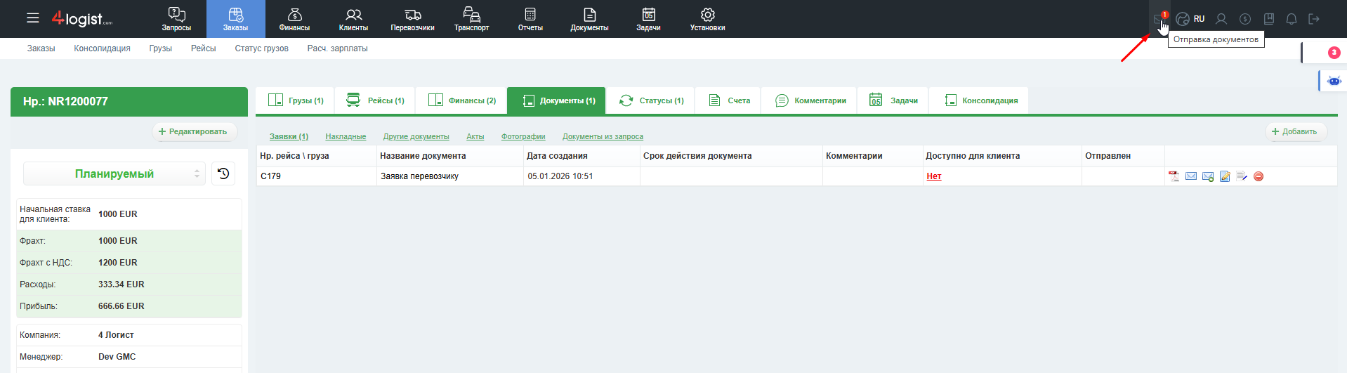 Сначала найдите документ, который хотите отправить — это может быть заявка, счёт, акт или любой другой документ в системе.