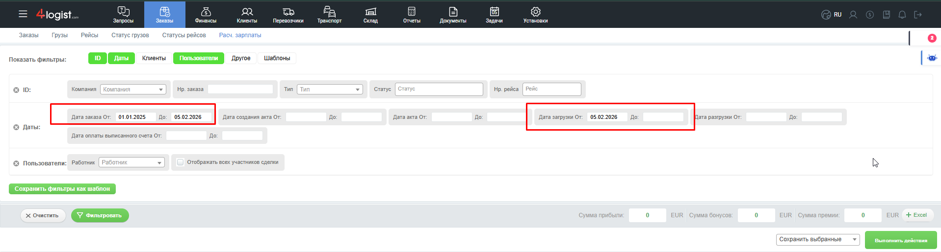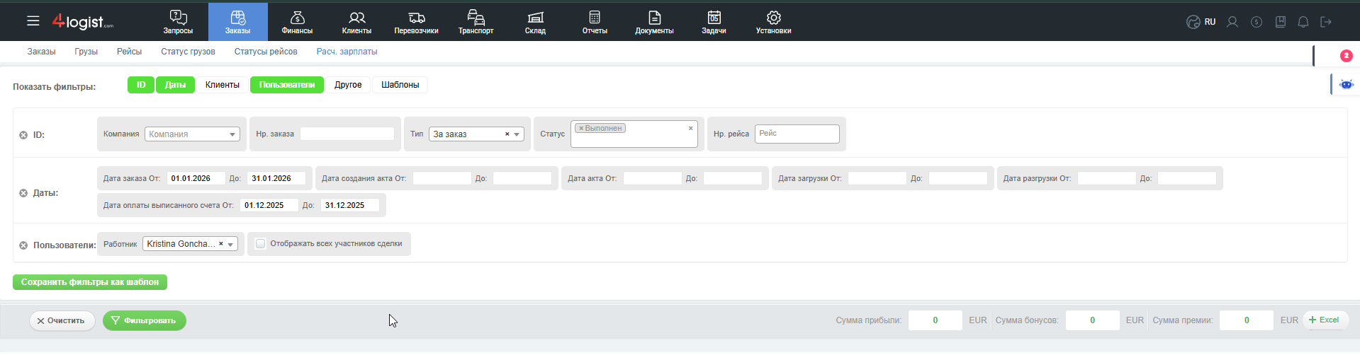 Фильтр «За рейс» выберет бонусы только тех пользователей, которые были отмечены экспедиторами в рейсах