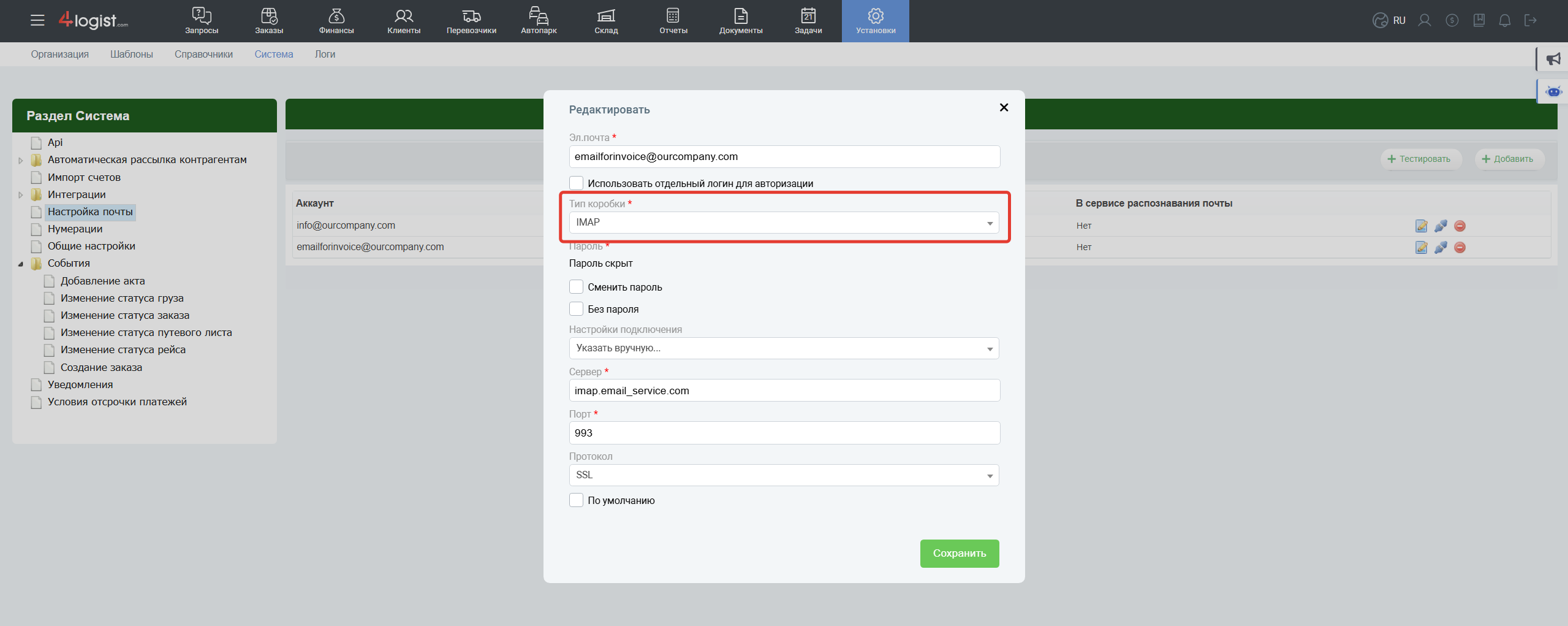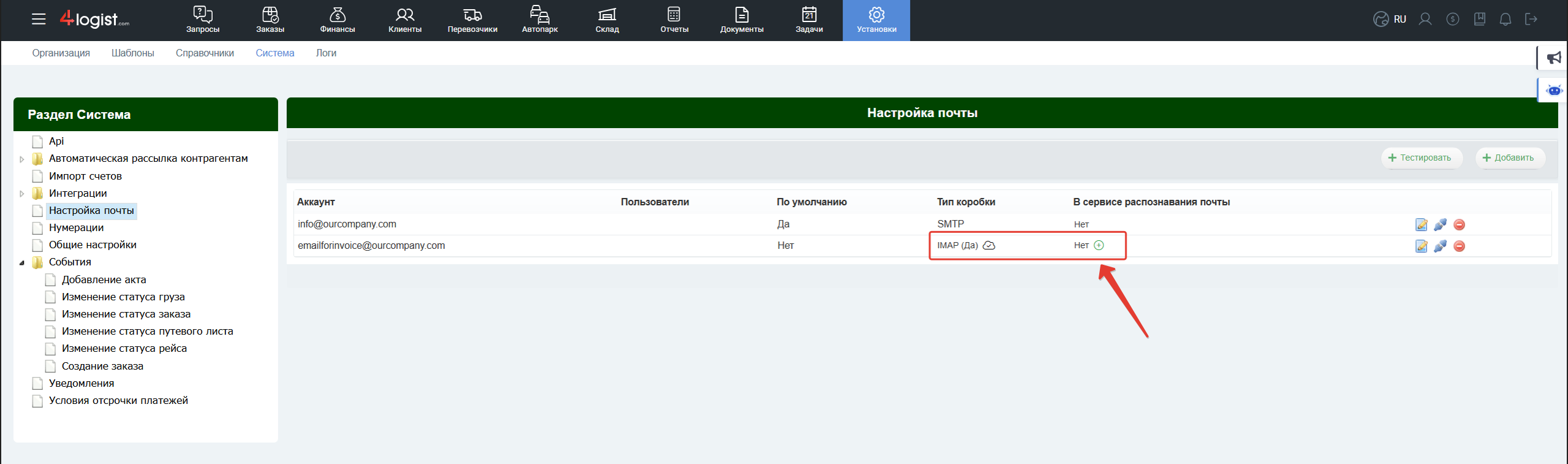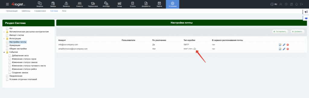В разделе «Установки > Система > Настройка почты» необходимо добавить почту, которую программа будет проверять на наличие писем с входящими счетами.