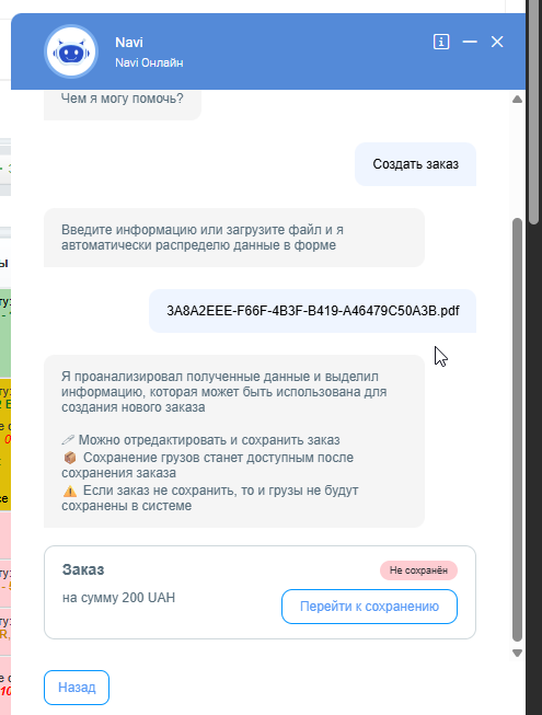Помощник NAVI помогает автоматически распознавать заявку клиента из загруженного файла и формировать на её основе заказ в системе. Это ускоряет обработку входящих заявок и снижает количество ручных действий.