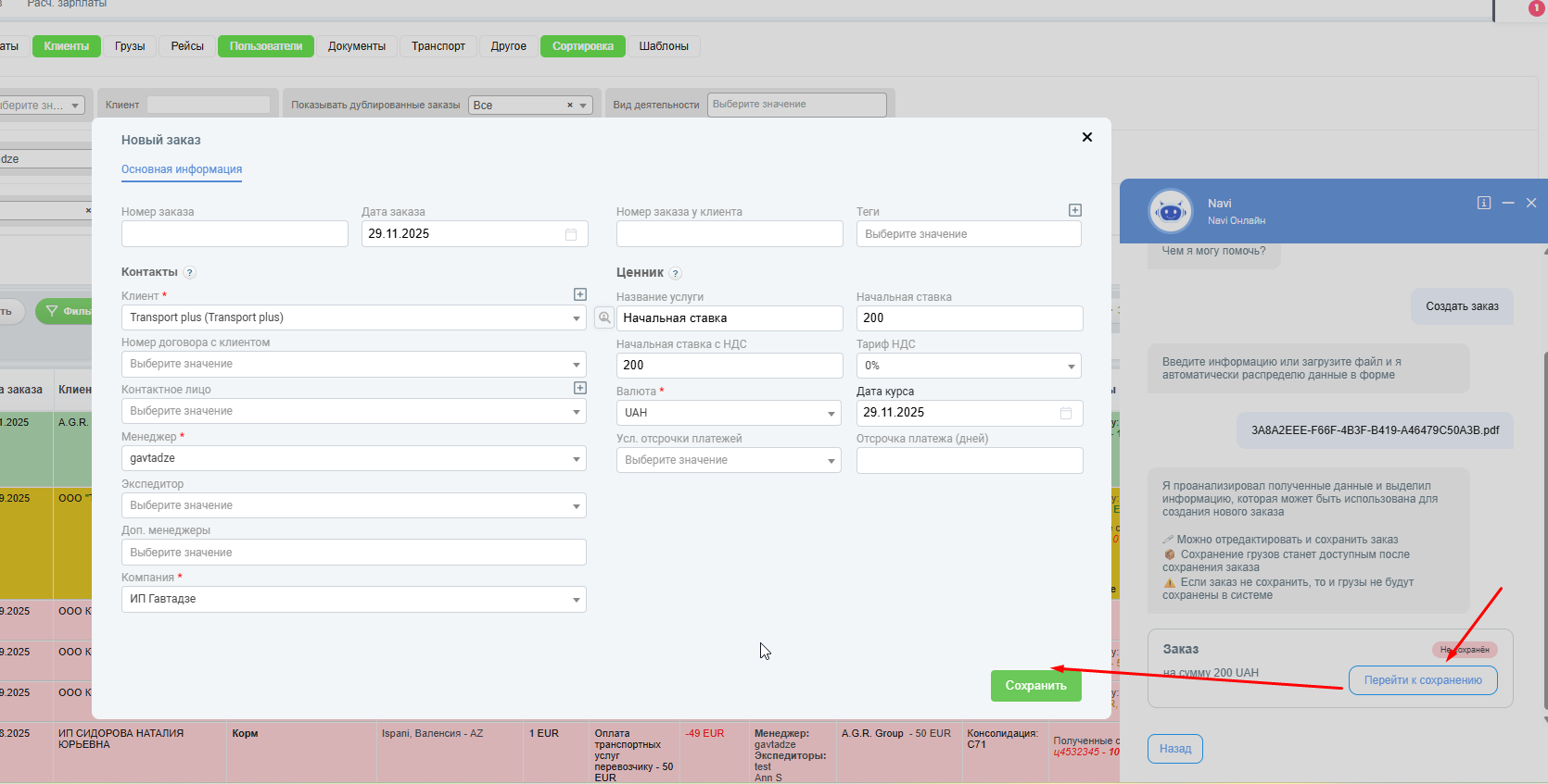 После сохранения в системе будет создан новый заказ на основе данных, извлечённых из вашего файла заявки.