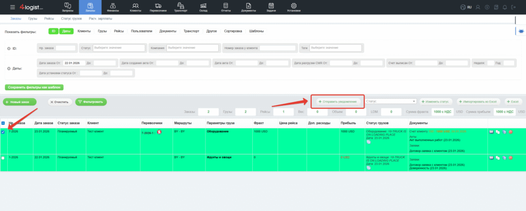 В блоке «Заказы» выбираем заказы, в которых нужно отправить уведомление о документах и нажимаем на кнопку «Отправить уведомление»