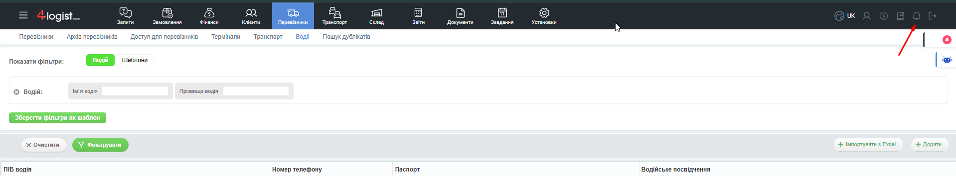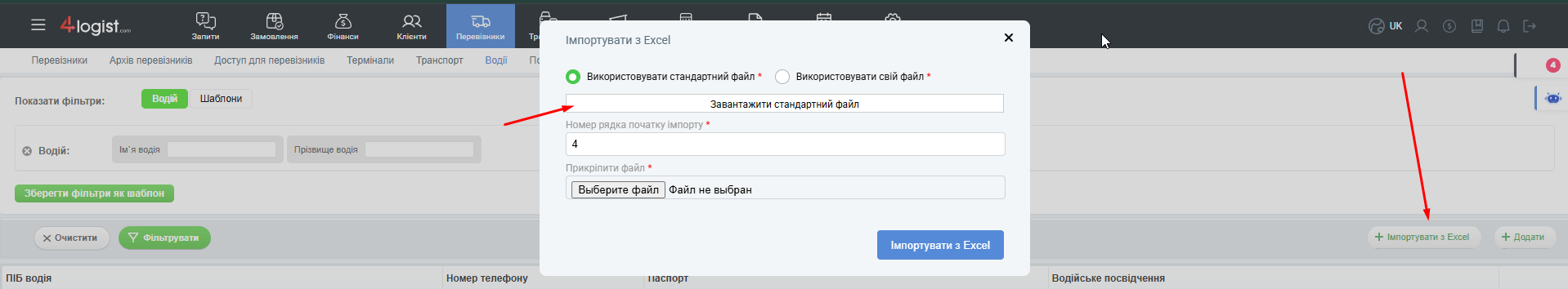 У 4logist є можливість імпортувати водіїв з файлу Excel.