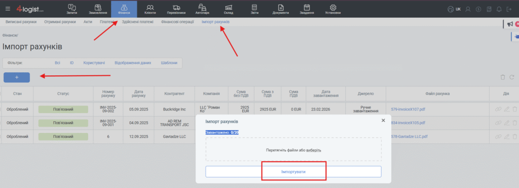 Розділ «Імпорт рахунків» призначений для автоматизації обробки вхідних рахунків від контрагентів. Функціональність дозволяє завантажувати рахунки в форматі PDF, розпізнавати їх за допомогою вбудованого сервісу, перевіряти коректність даних і пов’язувати рахунки з вже існуючими витратами в системі.