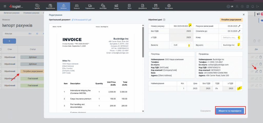 - перевірка коректності контрагента і компанії-одержувача;
