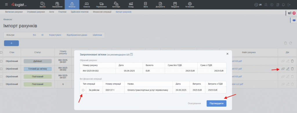 Користувач натискає «Зв’язати з витратою», після чого система пропонує список відповідних витрат. У першу чергу відображаються витрати з повним (100%) збігом.