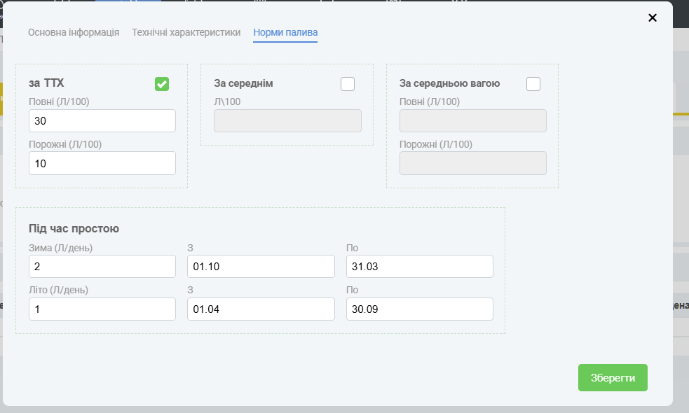 - Перейти на вкладку Норми палива, вказати: