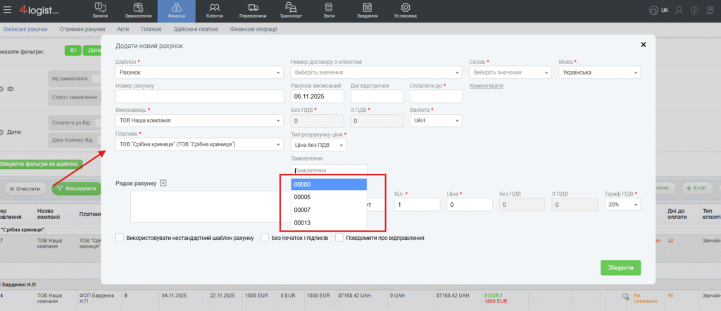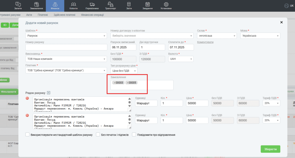 У формі потрібно вибрати шаблон, платника (клієнта), дату оплати і додати замовлення, для яких виставляється рахунок. Кожне замовлення стане рядком рахунку.