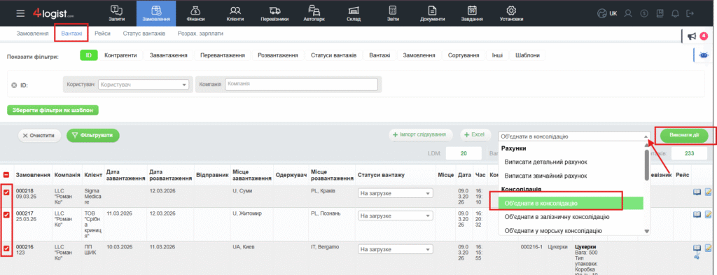 - Праворуч (над таблицею із вантажами), виберіть дію ‘Об’єднати в консолідацію’