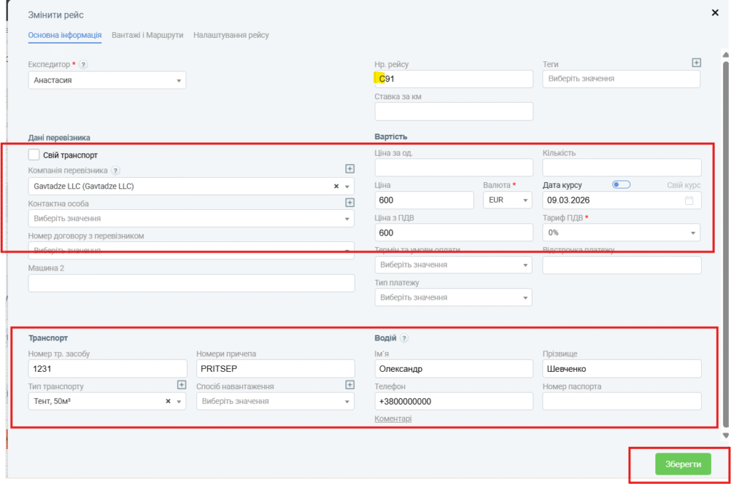 Відкриється вікно створення рейсу. Консолодівані рейси в системі, за замовчуванням, мають номер С… Вам необхідно внести інформацію щодо вартості рейсу, вибрати перевізника, договір з перевізником, транспорт і водія.