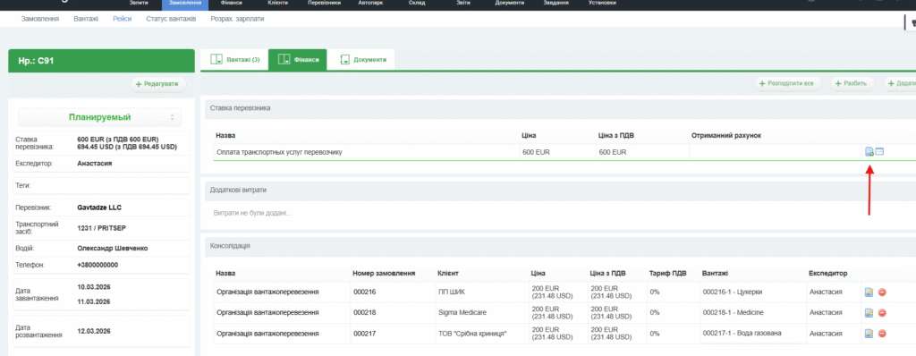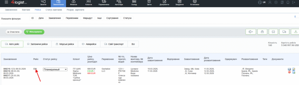 Щоб розподілити вартість рейсу між усіма замовленнями, вантажі з яких беруть участь у консолідації, потрібно перейти в картку рейсу. Зробити це можна, натиснувши на номер рейсу в загальній таблиці рейсів або в замовленні.