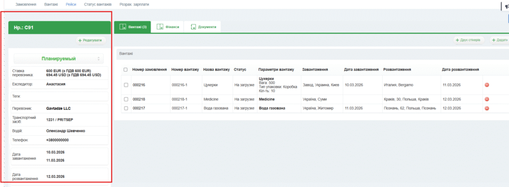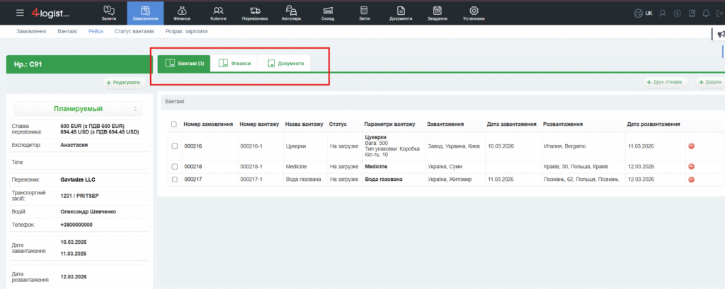 Праворуч є вкладинки: Вантажі, Фінанси, Документи