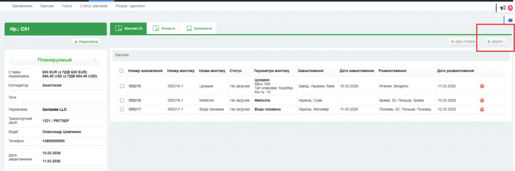 На вкладинці “Вантажі” можна переглянути список вантажів, що входять в даний рейс, а також видалити і додати вантажі в рейс (кнопка +Додати).