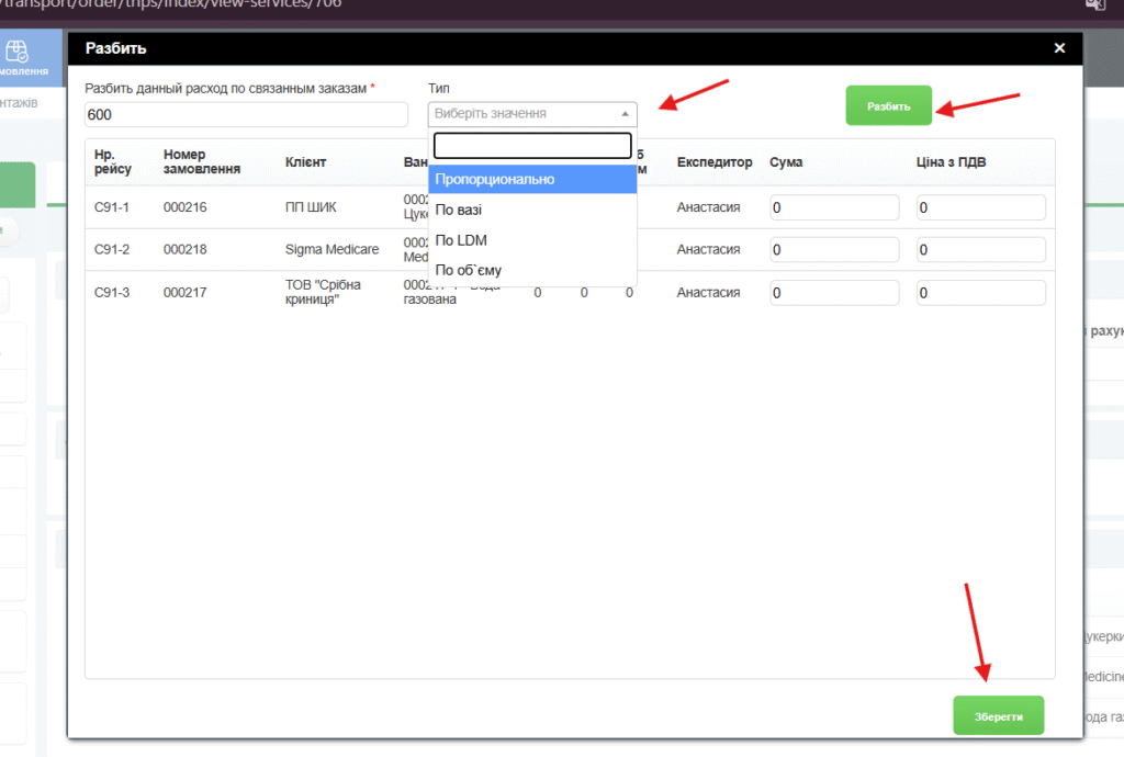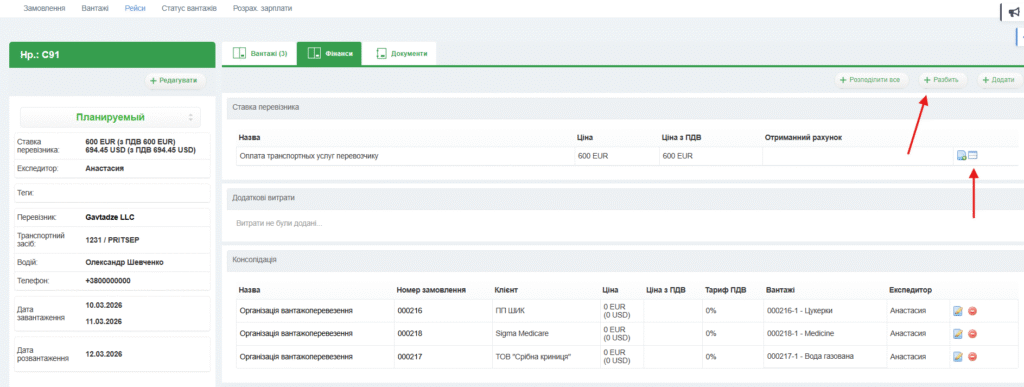 Ставку або будь-яку іншу витрату рейсу можна розподілити між замовленнями, які входять до складу консолідаційного рейсу.