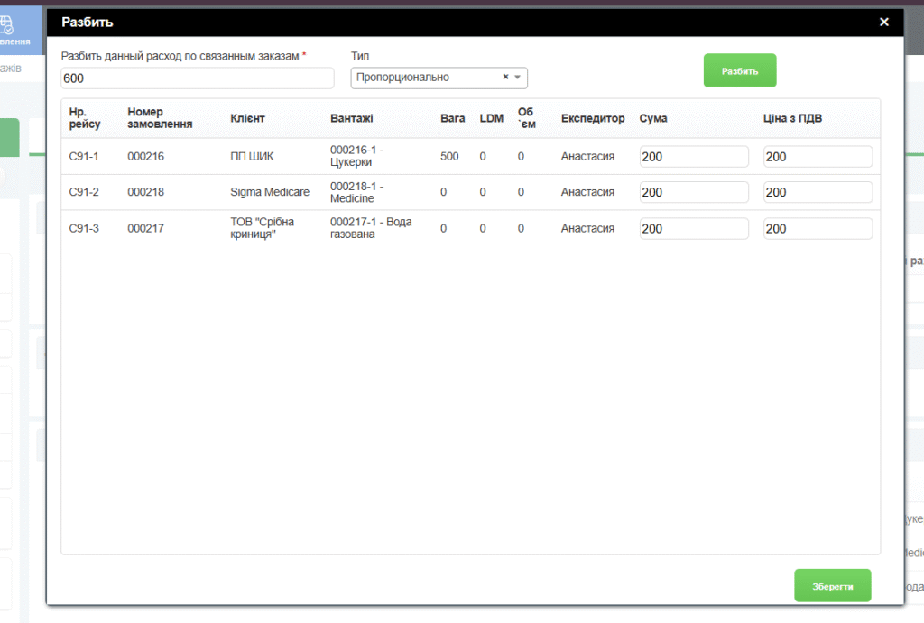 Якщо у вас вантаж замовлення їде в консолідаційному рейсі, в витрати замовлення заноситься тільки та частина, яку ви розподілили на цей конкретний вантаж.