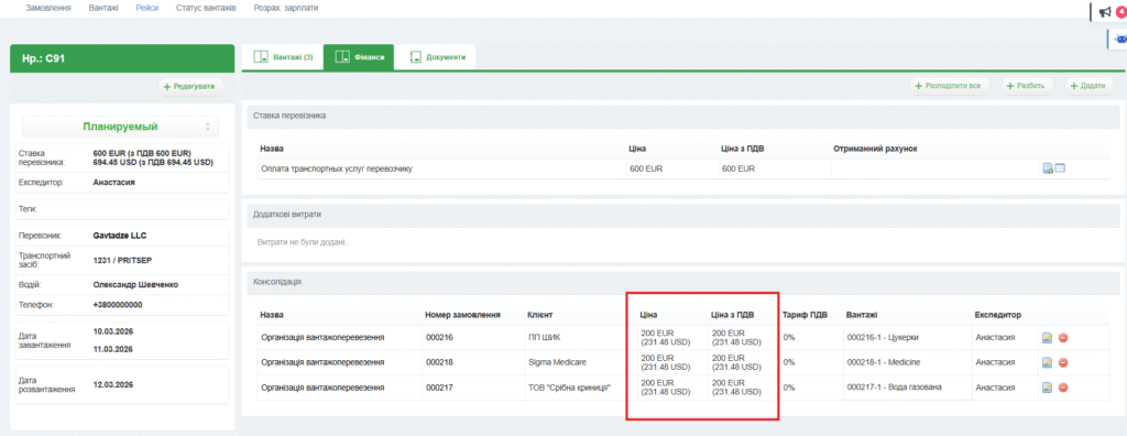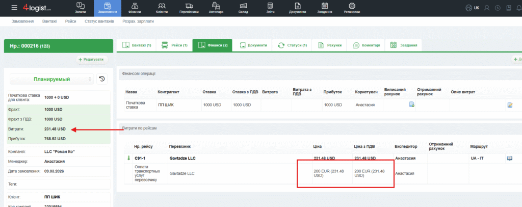 На вкладці Рейси в замовленні ми можемо бачити, що рейс коштує 600 Євро, а витрати на конкретний вантаж з даного замовлення – 200 Євро