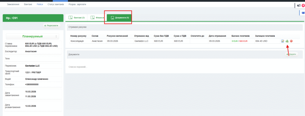 Найшвидший і зручний – перейти на вкладку Фінанси (у рейсі або в замовленні), там знайти послугу Оплата транспортних послуг перевізника і натиснути на іконку додавання рахунку.