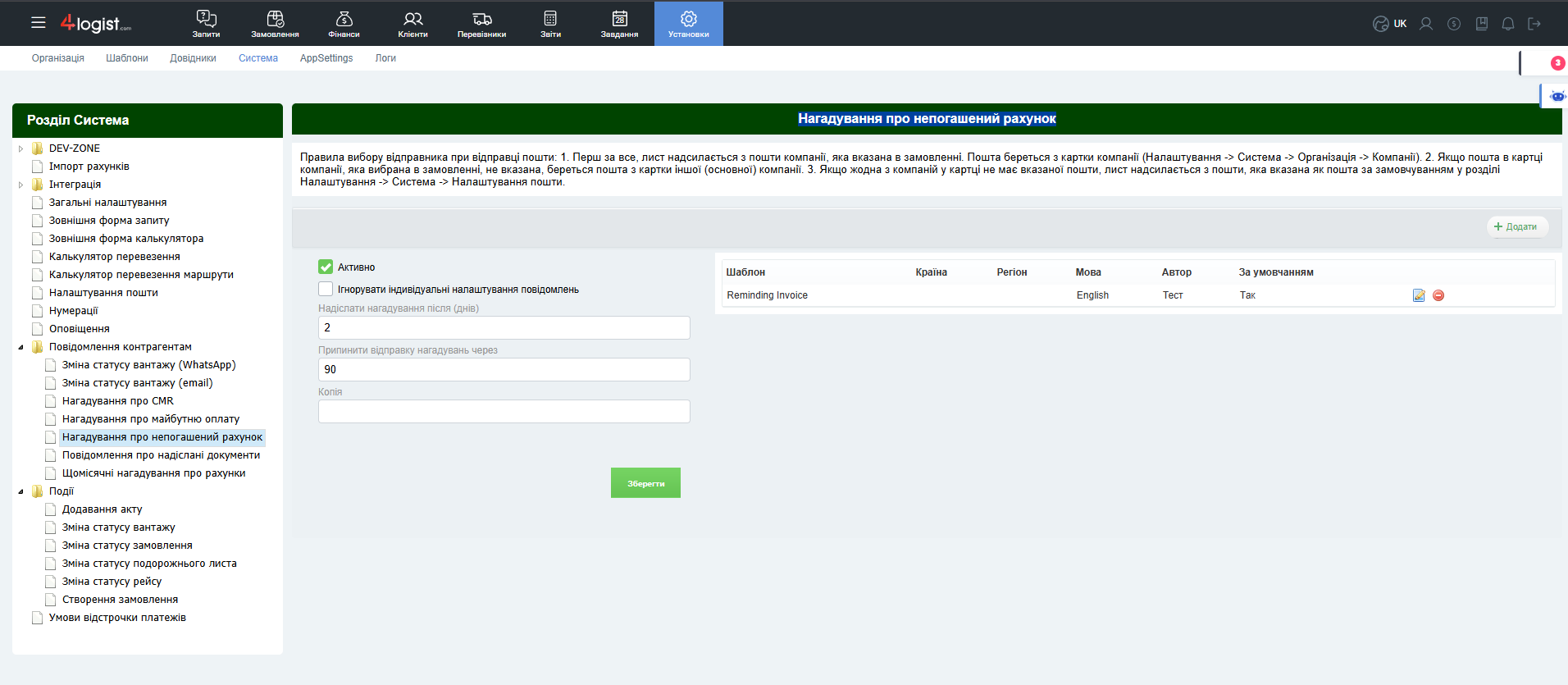 Додається шаблон тексту, який буде розташований в тілі листа з прикріпленим рахунком. Сам текст можна відредагувати в Розділі Шаблони.