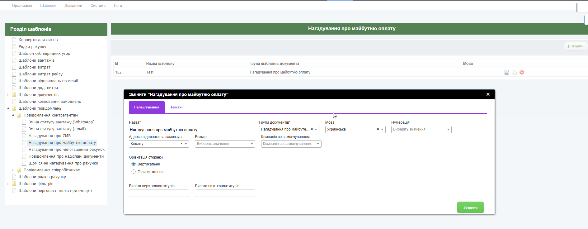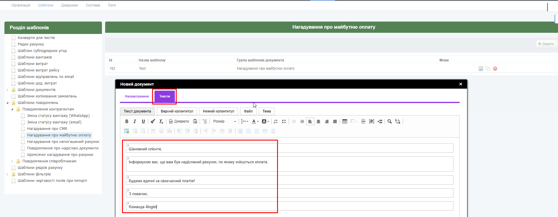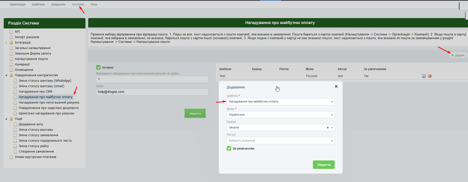 Збережіть та перейдіть до створення самого нагадування: Установки – Система – Повідомлення контрагентам – Нагадування про майбутню оплату.