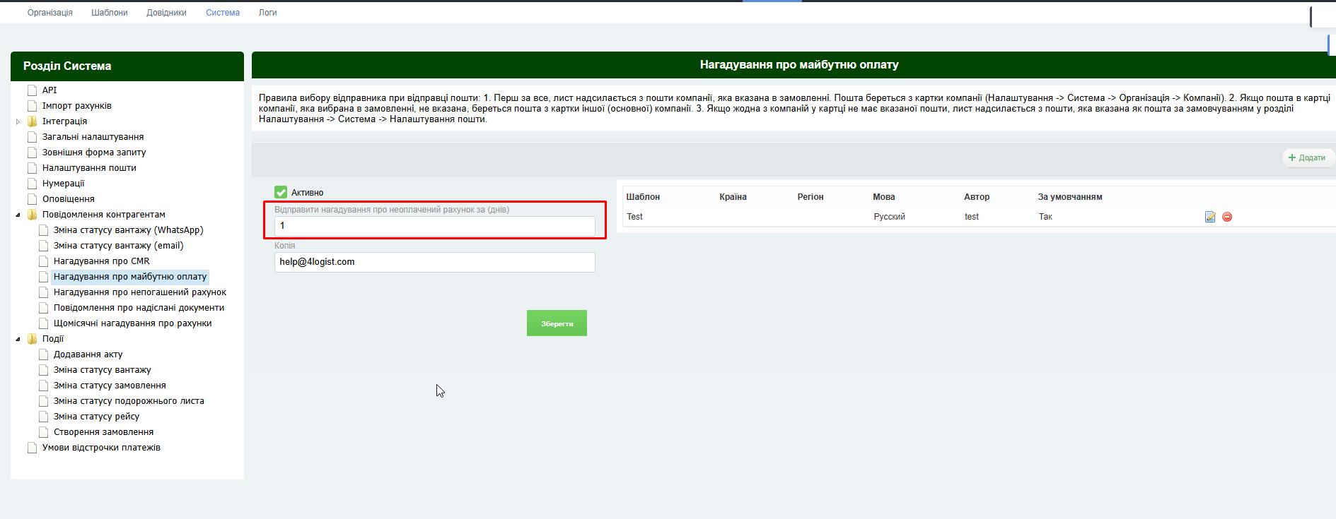 Перейти в Установки – Шаблони – Шаблони повідомлень – Повідомлення контрагентам – Нагадування про майбутню оплату – натиснути Додати в правій частині розділу.