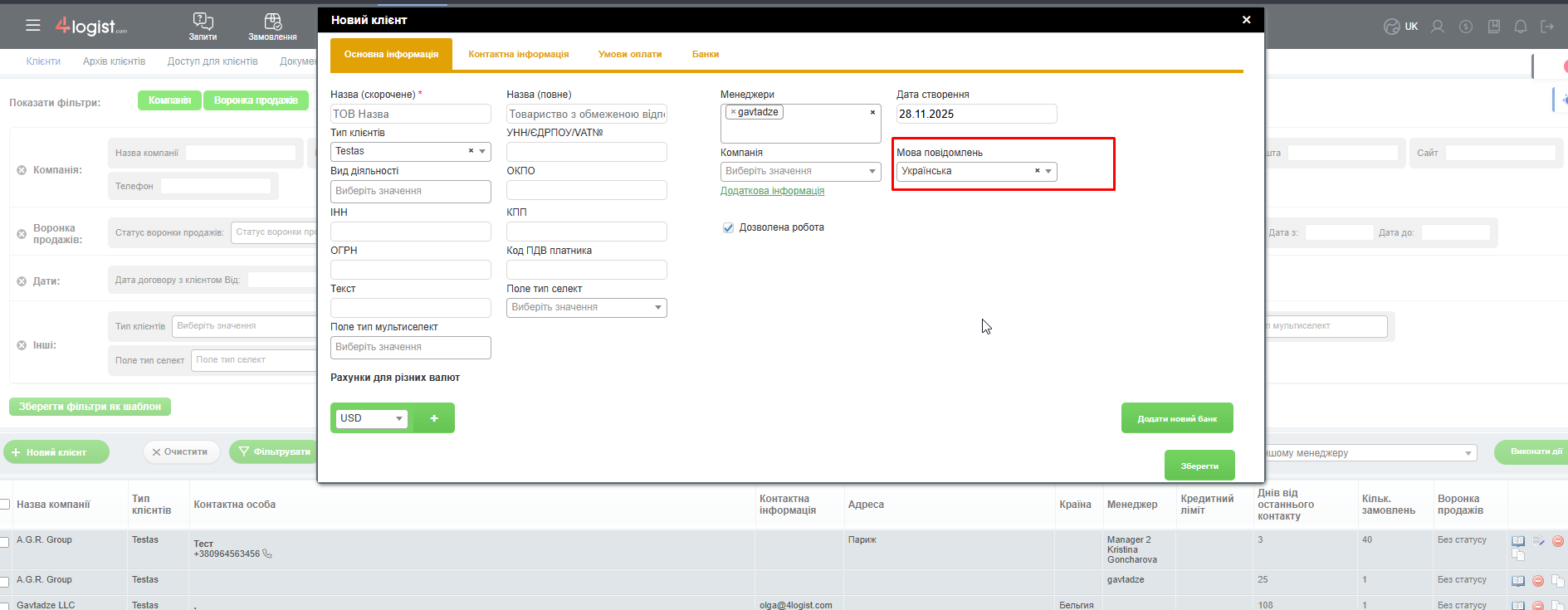 Мова сповіщень також має бути вказана в картці клієнта.