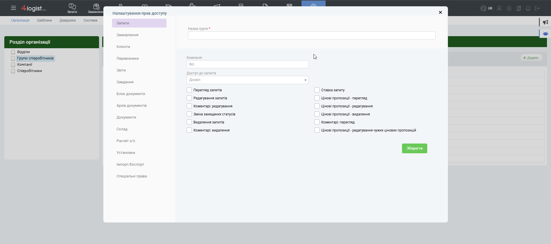 Панель налаштувань прав доступу включає в себе Розділи – Запити, Замовлення, Клієнти і т. д у відповідності з розділами системи.