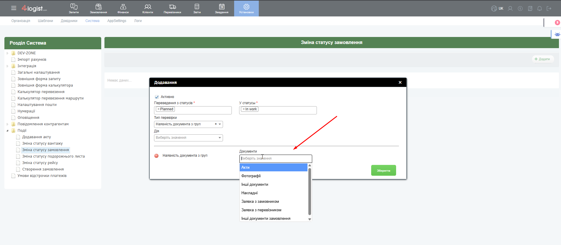 Праворуч треба натиснути +Додати, потім у формі, потрібно вибрати статуси, при перекладі з яких і в які буде виконуватися перевірка або дію.