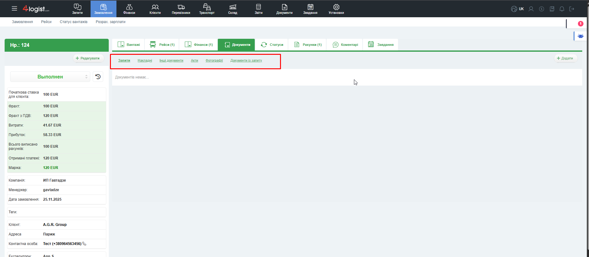 - Наявність документів ‘Отриманий рахунок’ – В замовленні повинні бути додані рахунки до всіх витрат – до рейсу і до всіх записів про витрати на вкладці Фінанси.