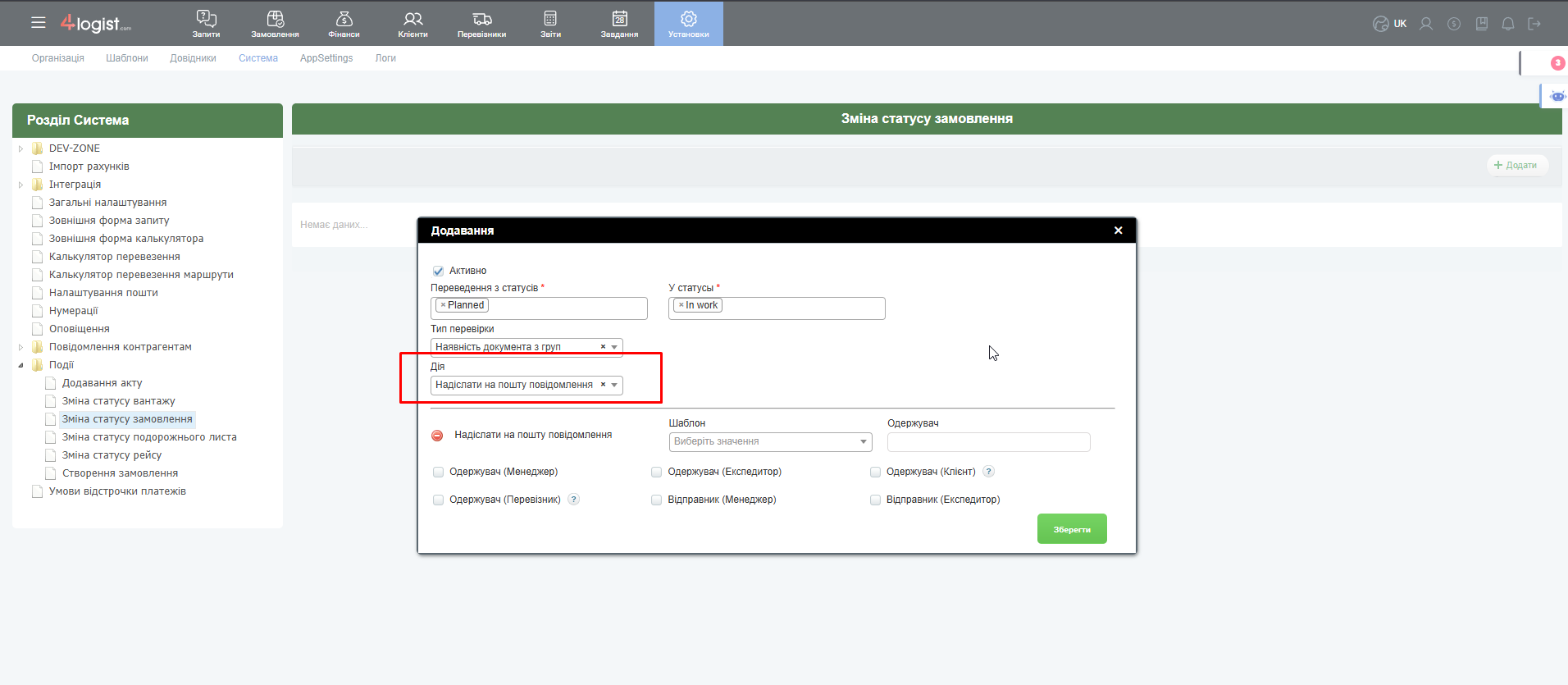 - Дія при зміні статусу замовлення. Приклад: якщо статус замовлення змінюється з Запланований на в Роботі, створити завдання бухгалтеру. Так при зміні певного статусу співробітник отримає листа на електронну пошту з інформацією про те, що статус змінено.